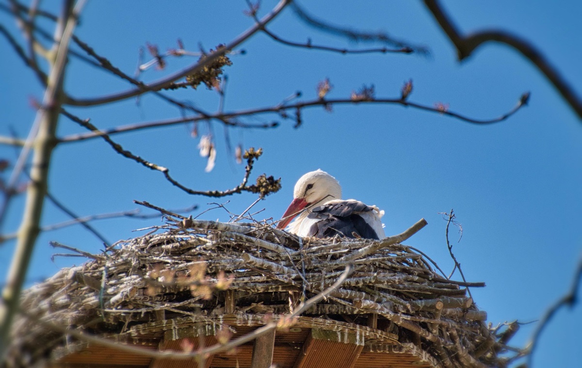 Тепер пара поводиться обережніше – лелеки по черзі залишають гніздо, щоб не втратити його знову.